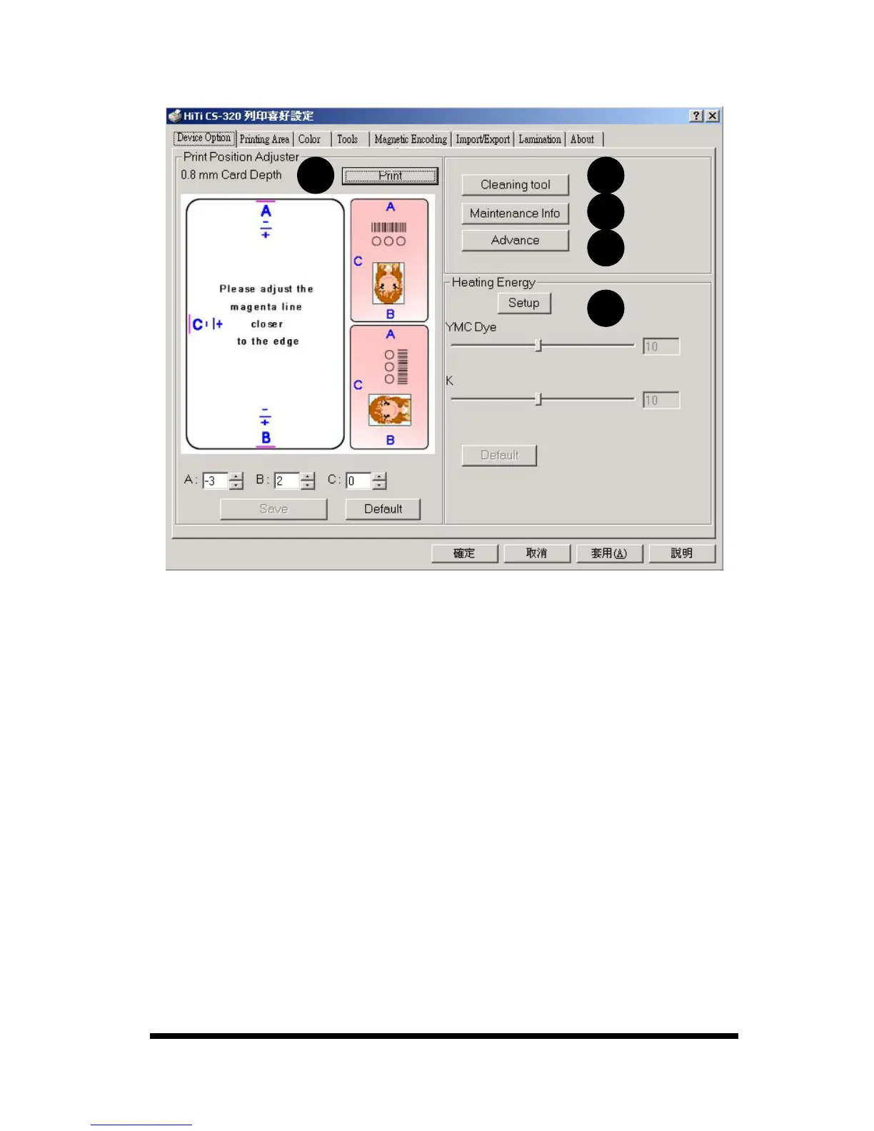 Heating Energy: You can set ”YMC Dye”, ”K” parameters, ranging from 1 to