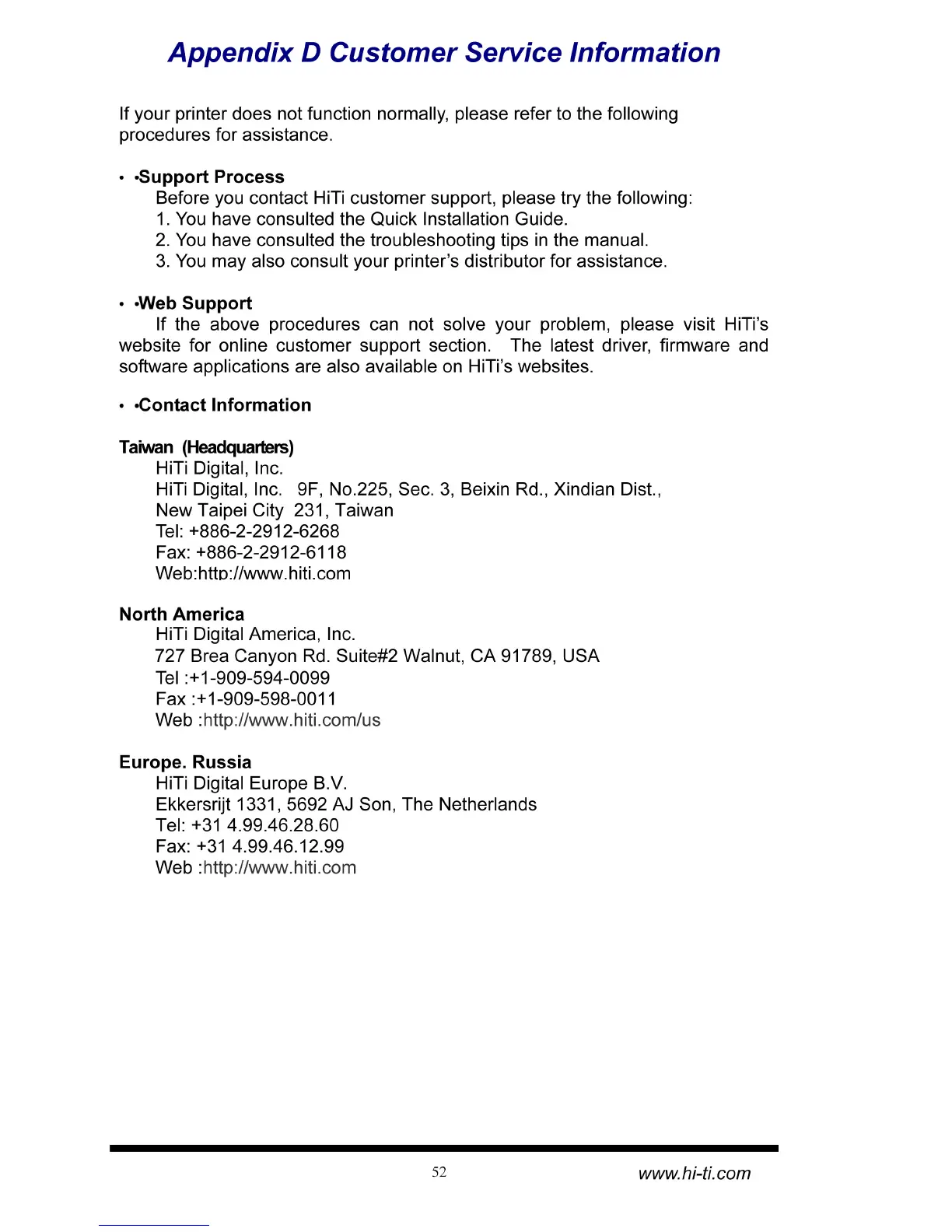 HiTi Digital CS-310 - Appendix D Customer Service Information