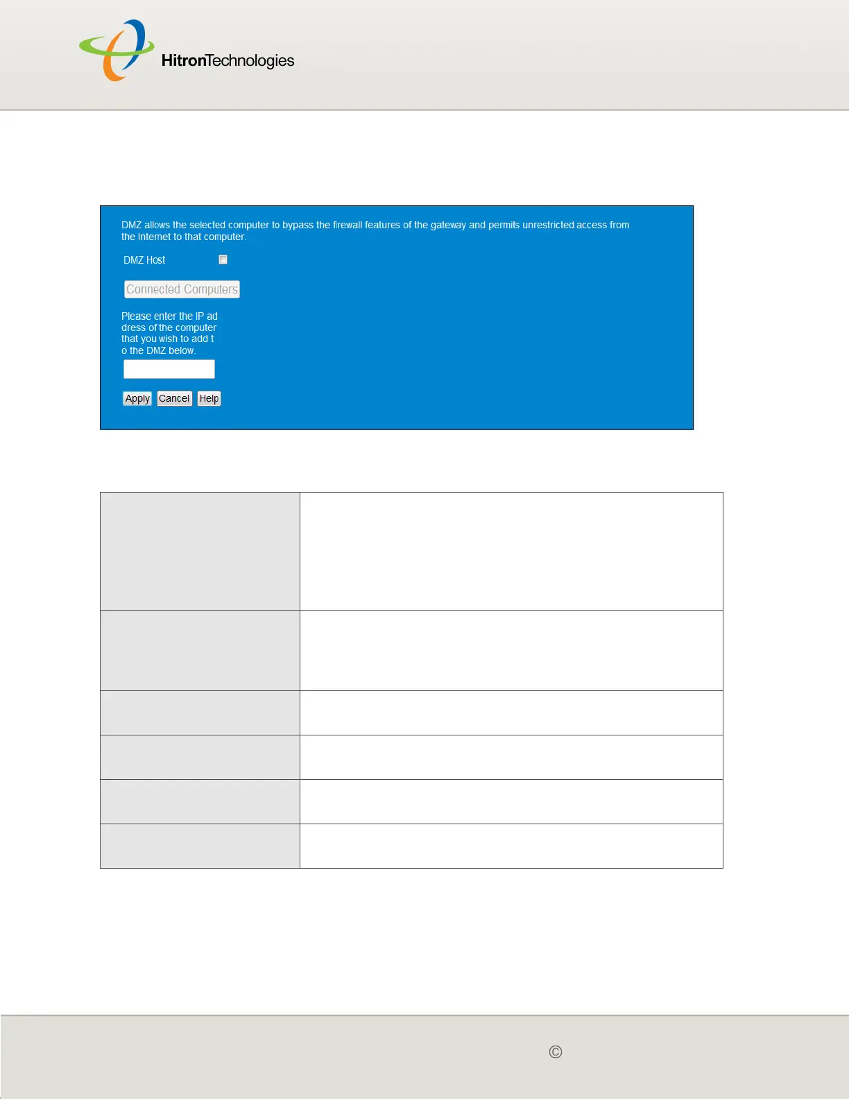 Enable DMZ Host Use this field to turn the DMZ on or off.