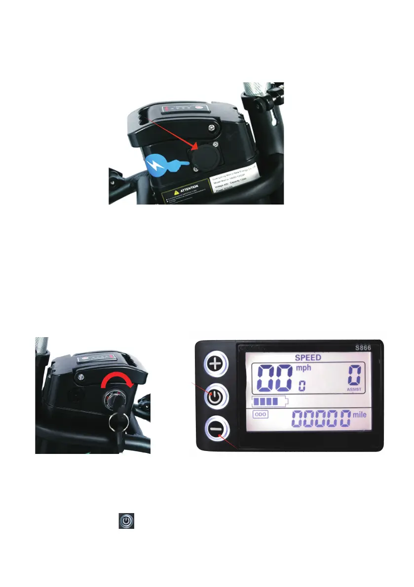 1. Charging: Unscrew the plastic cover on the battery (Picture 1), connect the charger to