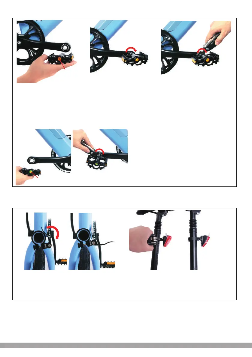 The right pedal is marked with "R" on the pedal shaft, first turn the pedal shaft clockwise by hand and