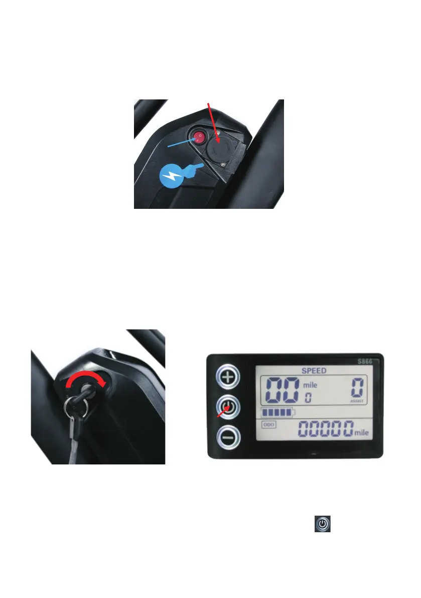 1. Charging: Unscrew the plastic cover on the battery (Picture 1), connect the charger to