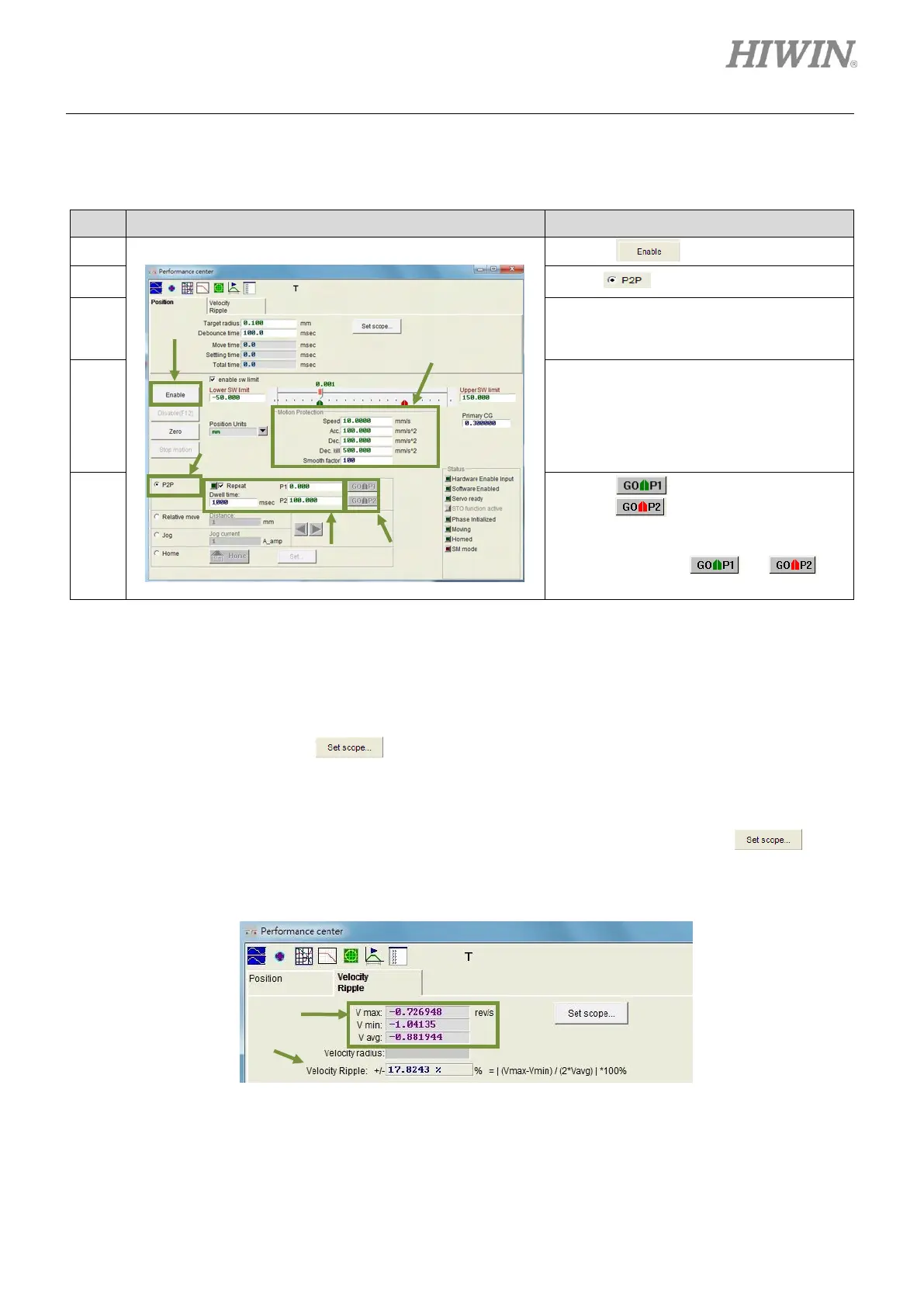 point-to-point (P2P) motion. V max, V min, V avg and Velocity Ripple show the maximum speed,