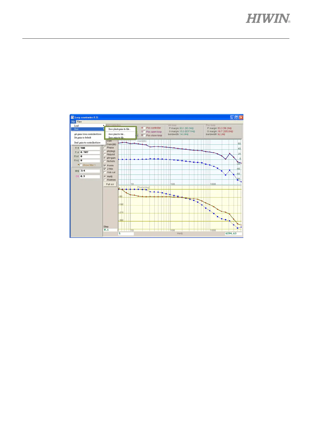 (1) Save plant + gains to file…: Save as .lop file. Control system and gains will be saved.