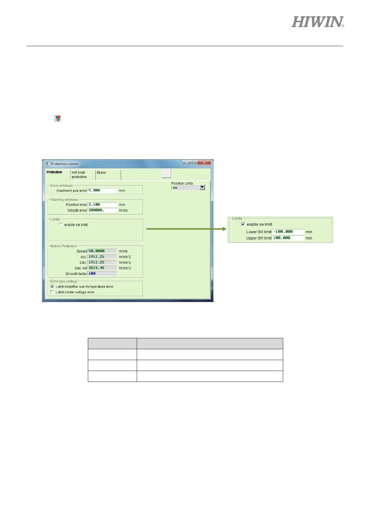 area of Limits. Check the checkbox of enable sw limit to set software limits. Software limit protection can