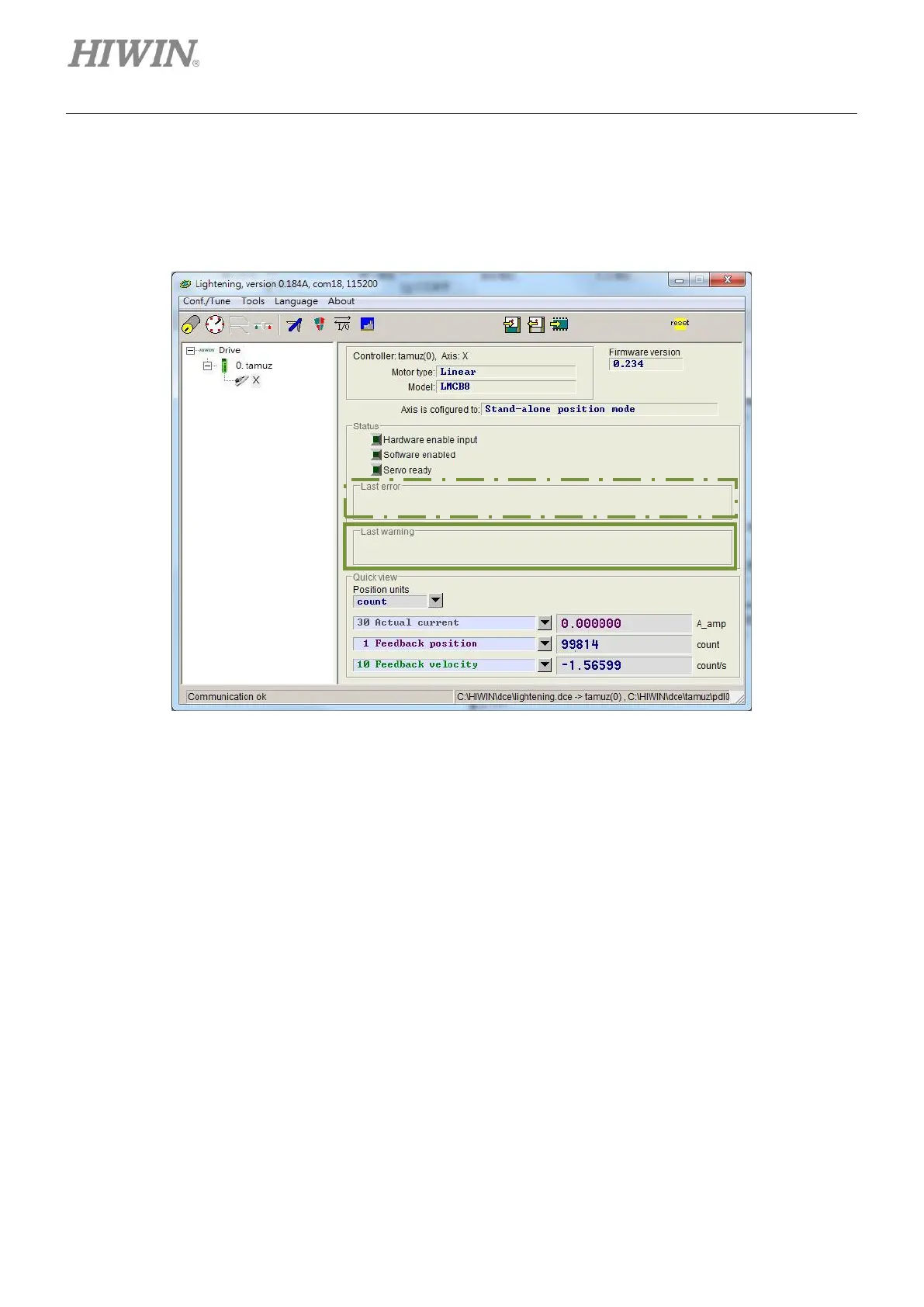 Last error. If a warning occurs, warning message will be displayed in the area of Last warning.