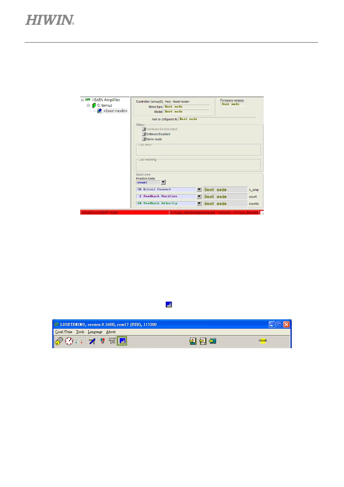 If power failure or communication interruption occurs during firmware update, Lightening stays in “Boot mode” and