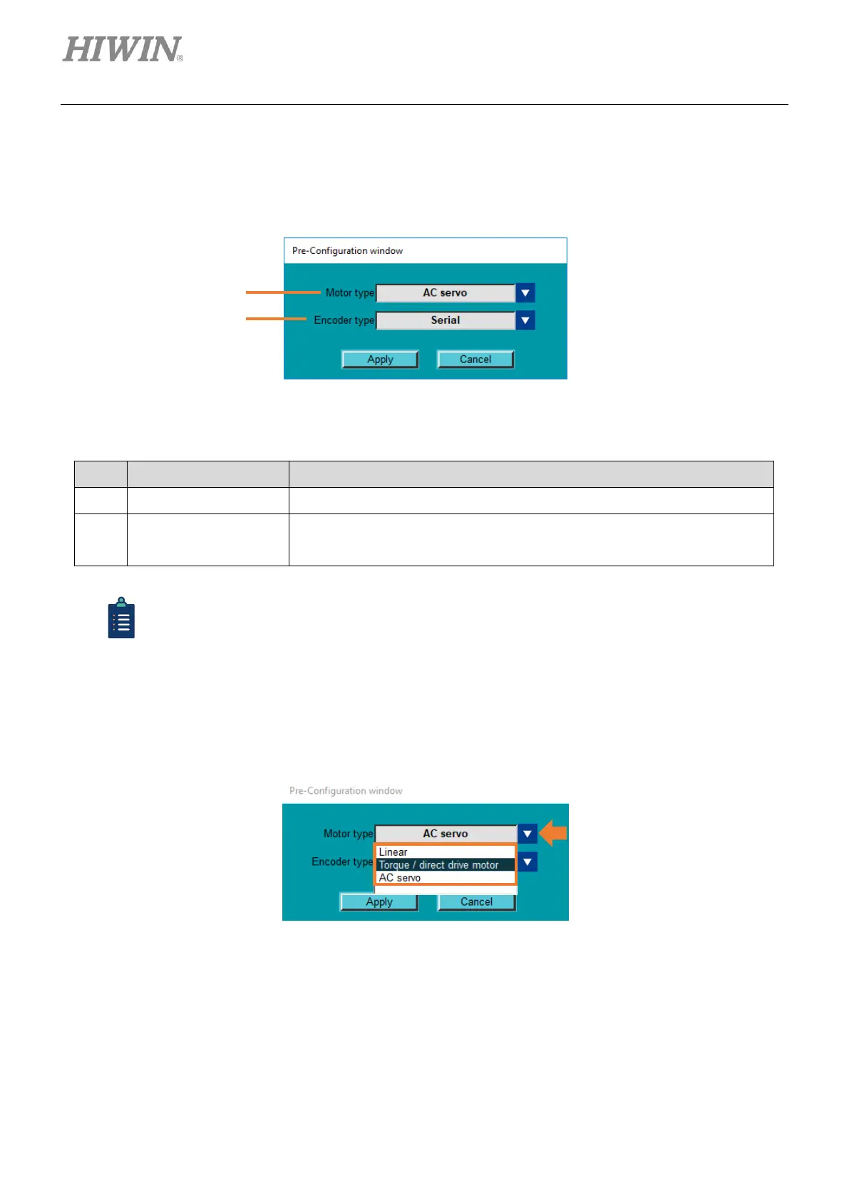 Before servo drive configuration, users can select servo motor type, encoder type and the usage of ESC.