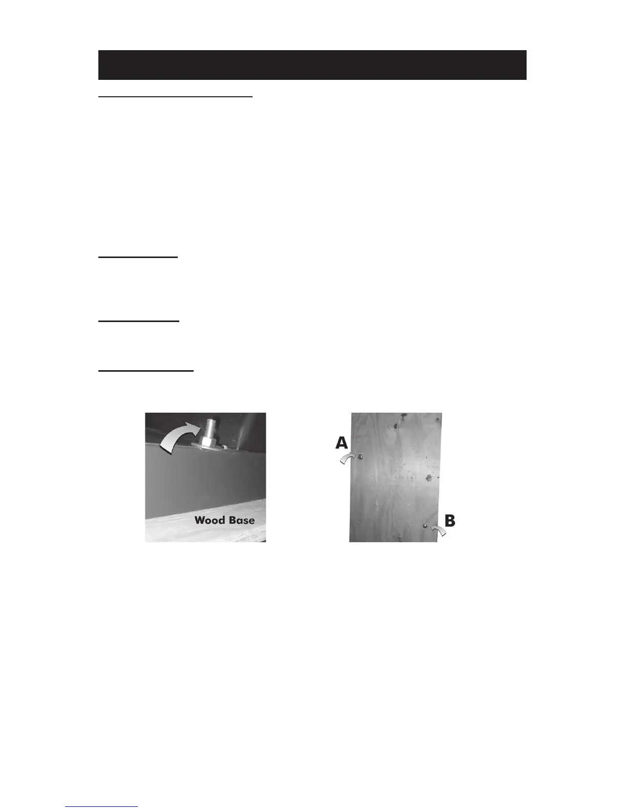 1. Remove plywood shipping base bolts (see A and B) and screw on feet