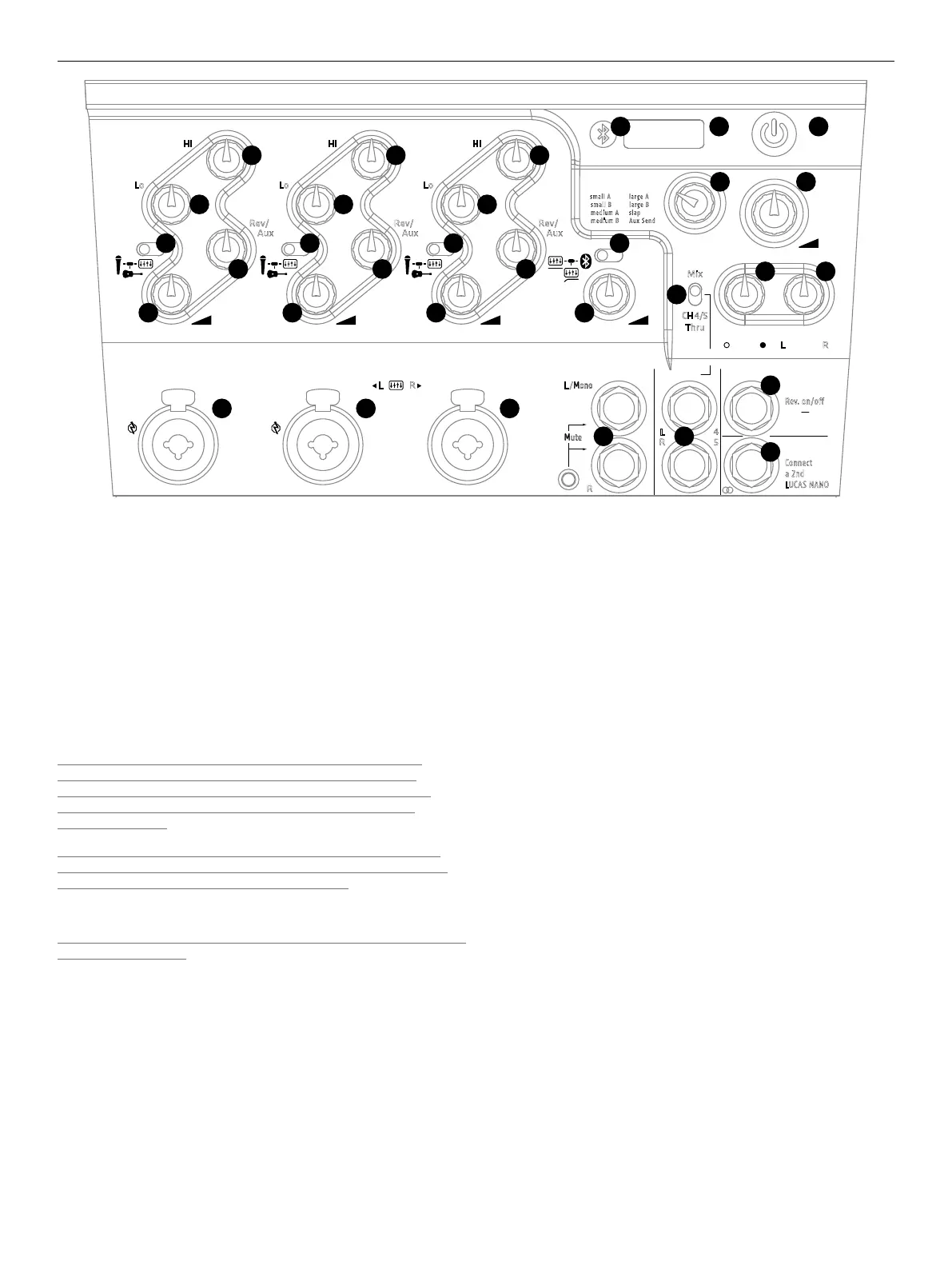 individualmente i rispettivi controlli per Hi-EQ, Lo-EQ, Rev/Aux e Gain/Vo-