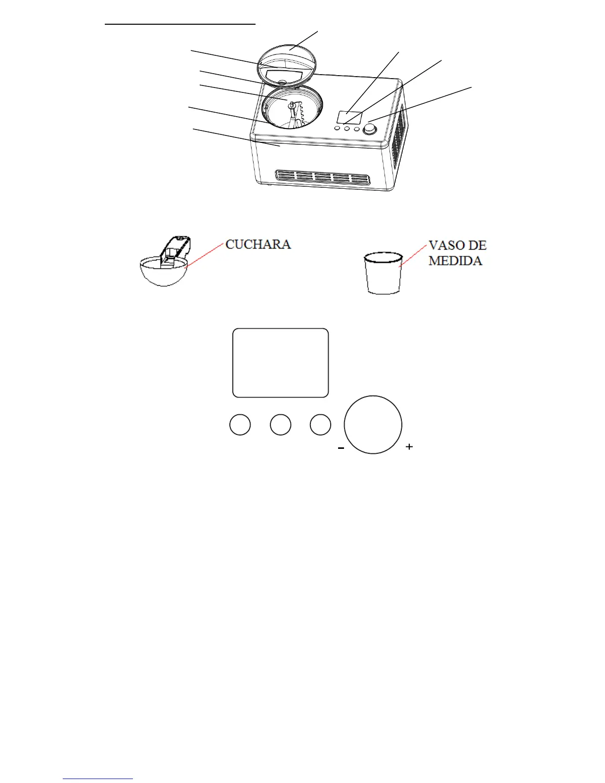 la tapa de llenado, la taza de medir y la cuchara).