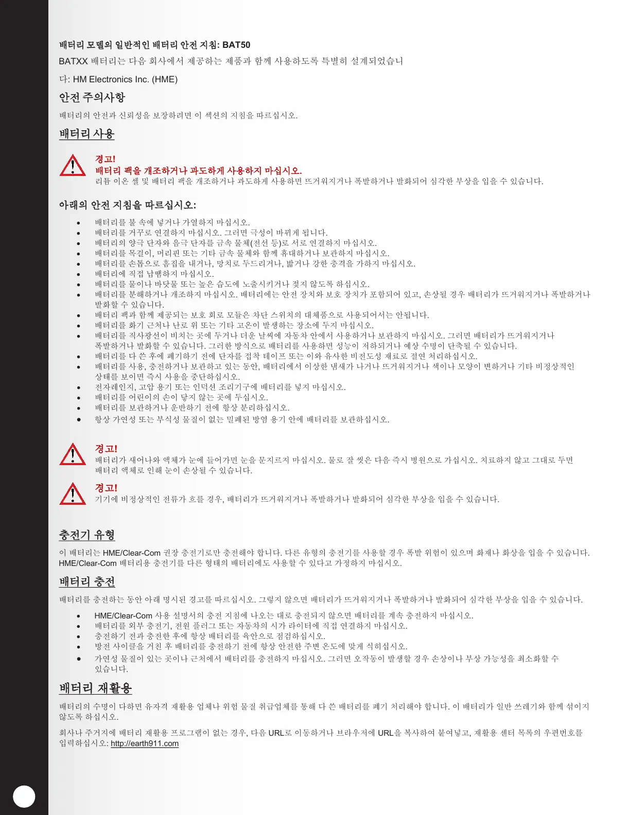 이 배터리는 HME/Clear-Com 권장 충전기로만 충전해야 합니다. 다른 유형의 충전기를 사용할 경우 폭발 위험이 있으며 화재나 화상을 입을 수 있습니다.