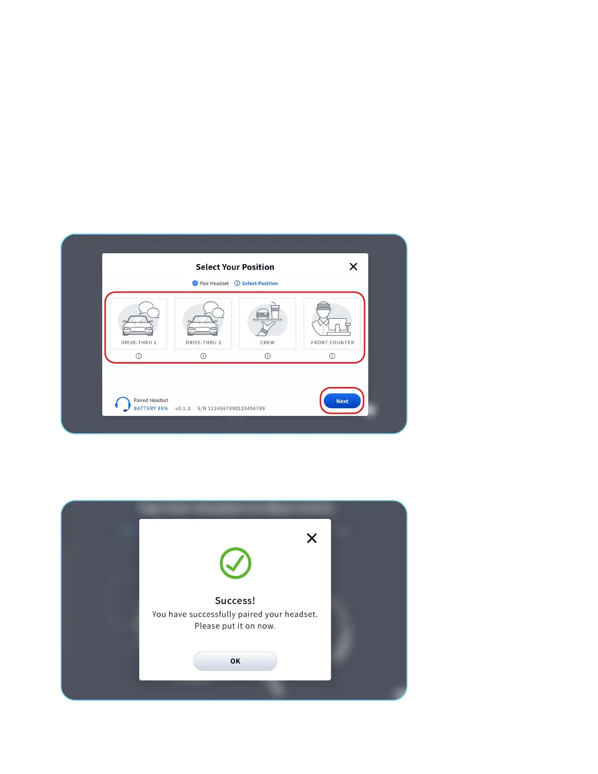 Note: If you select the Crew and Front Counter positions, the Success conrmation will immediately display, and your headset will
