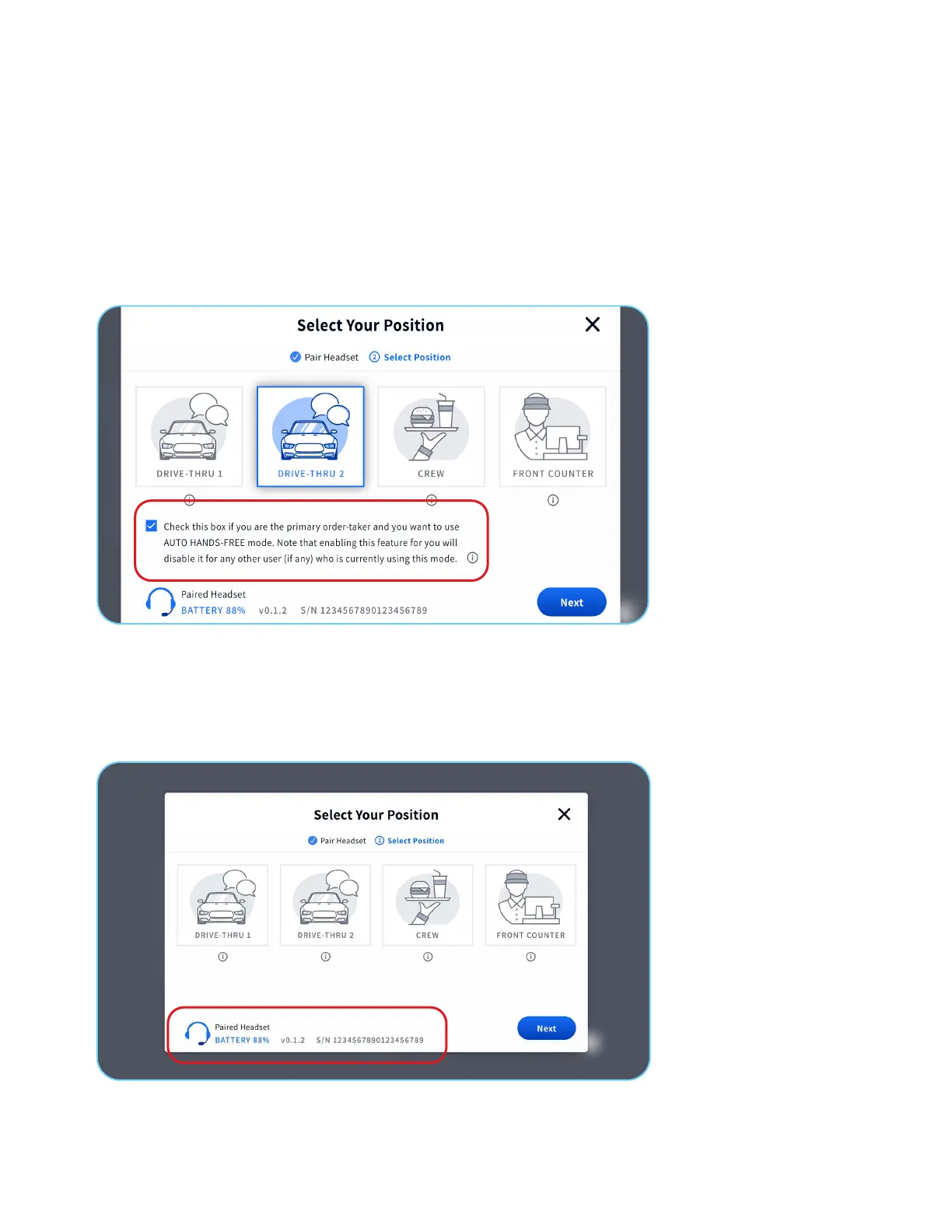 Note: Only one headset per lane and a maximum of two headsets per store can operate in Auto Hands-Free mode, one