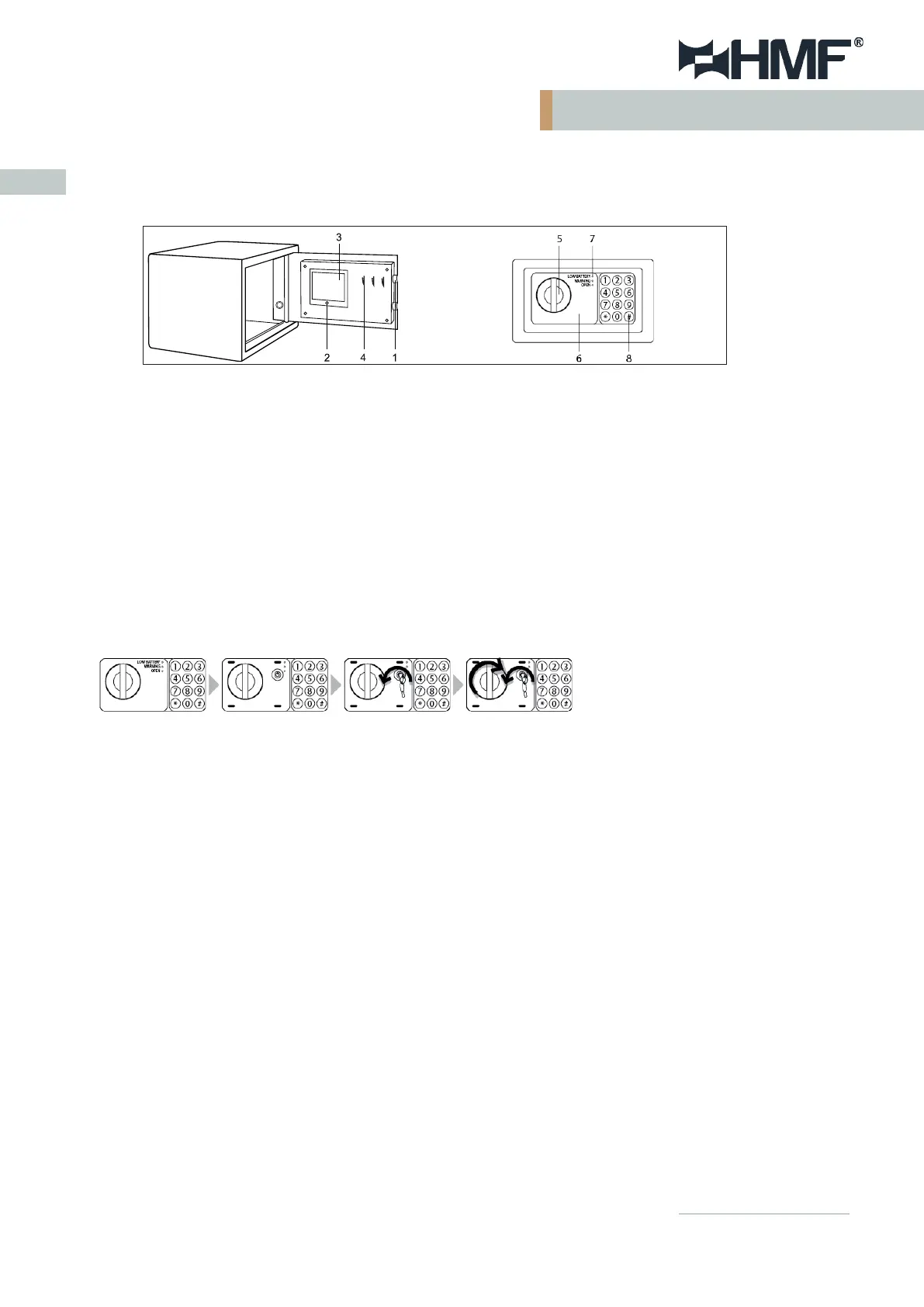 Cierra la puerta de la caja fuerte y gira el pomo (5) en sentido contrario a las agujas del reloj. La puerta está ahora cerrada
