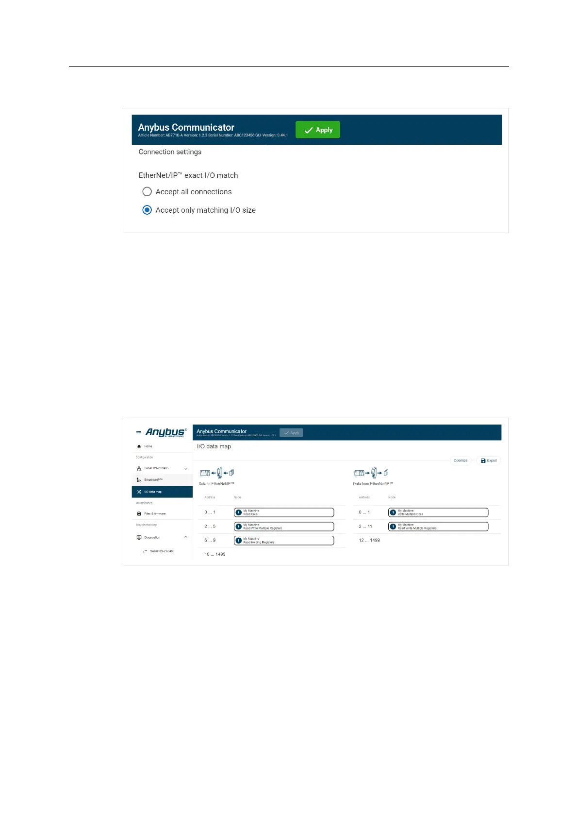 The connections must match the I/O size configured on the EtherNet/IP page, refer to To Use