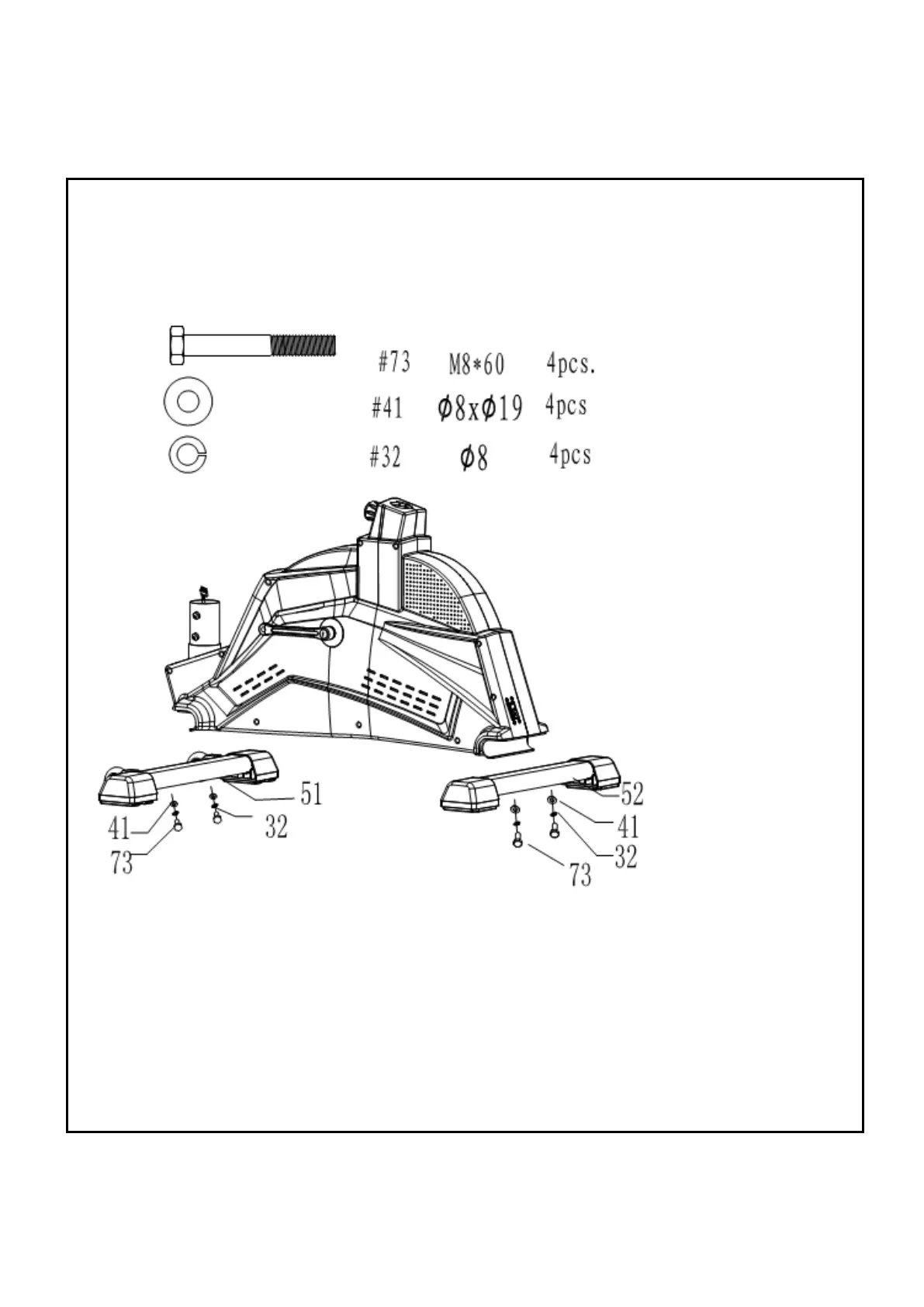 6. ZAdní stabilizátor (52) spojte s hlavním rámem (1) pomocí 2 šroubů73), 2 podložek32) a 2 podložek (41)