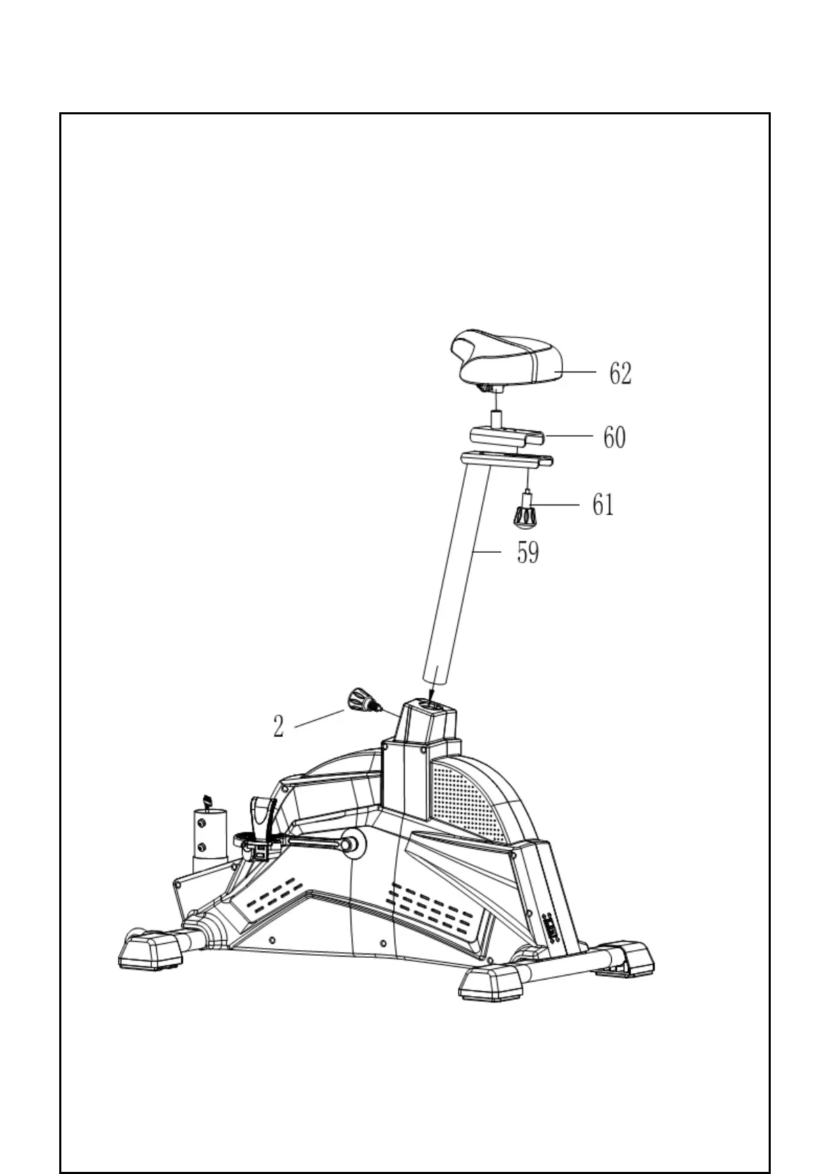 1.Sedlovou trubku59 zasu%nte do hlavního rámu1) a zajistěte šroubem2). Sedlo 62 přišroubujte
