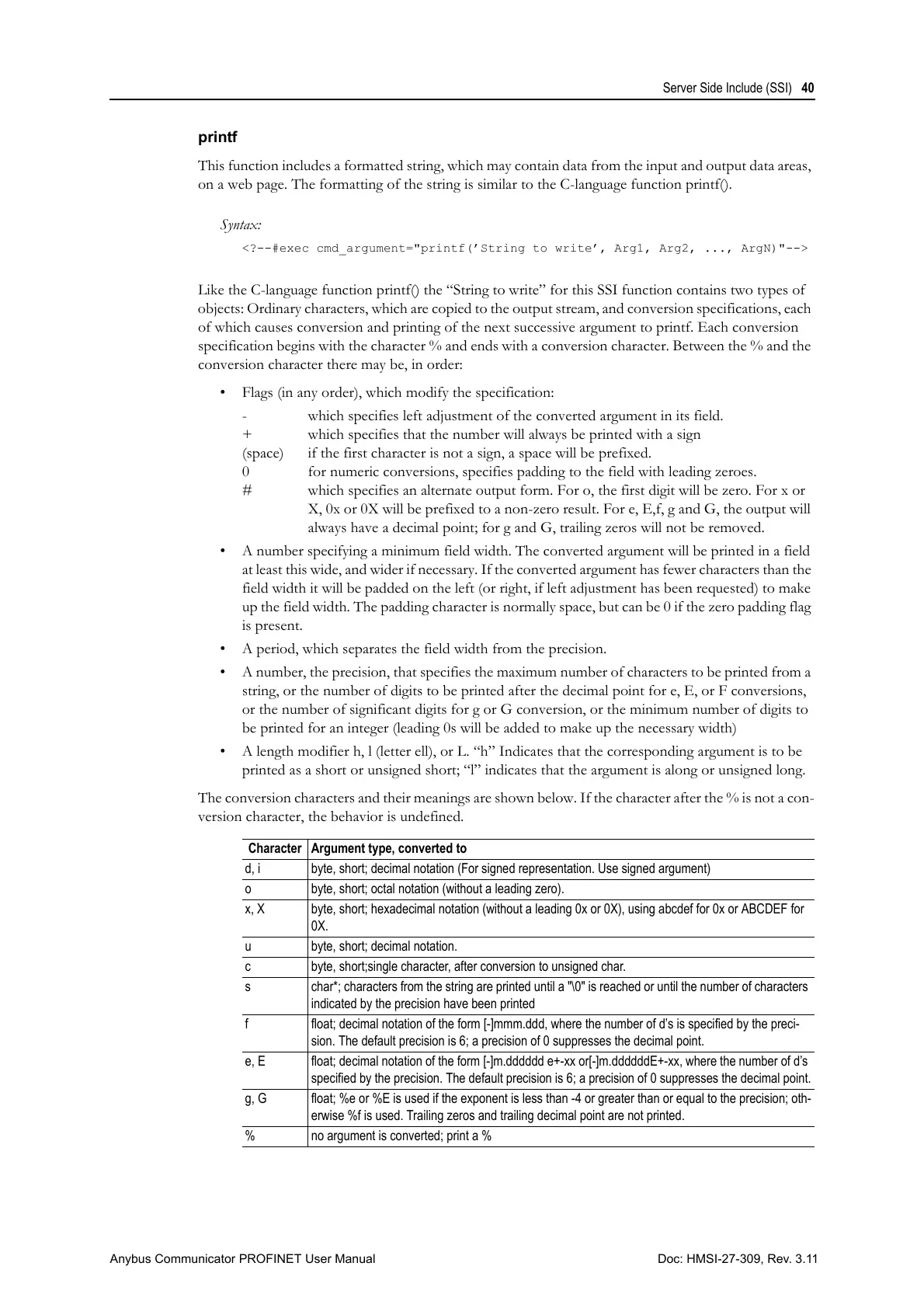 The conversion characters and their meanings are shown below. If the character after the % is not a con-