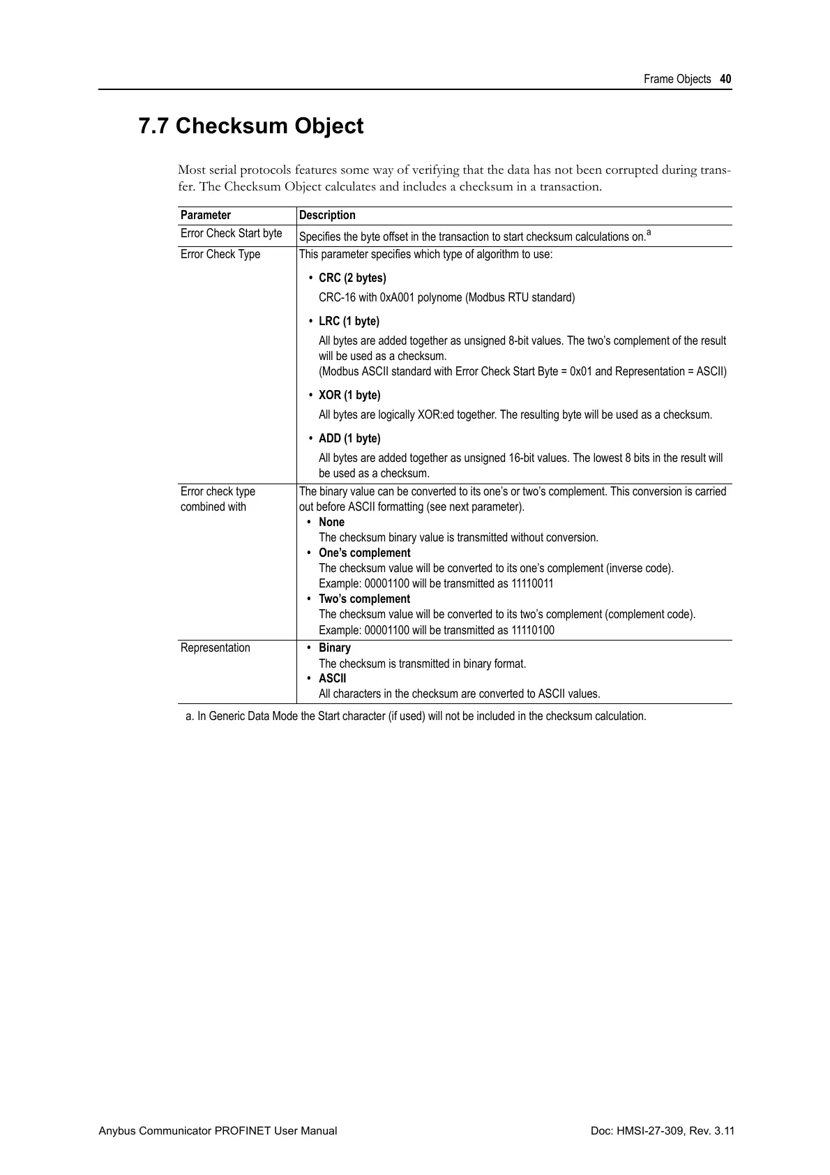 a. In Generic Data Mode the Start character (if used) will not be included in the checksum calculation.