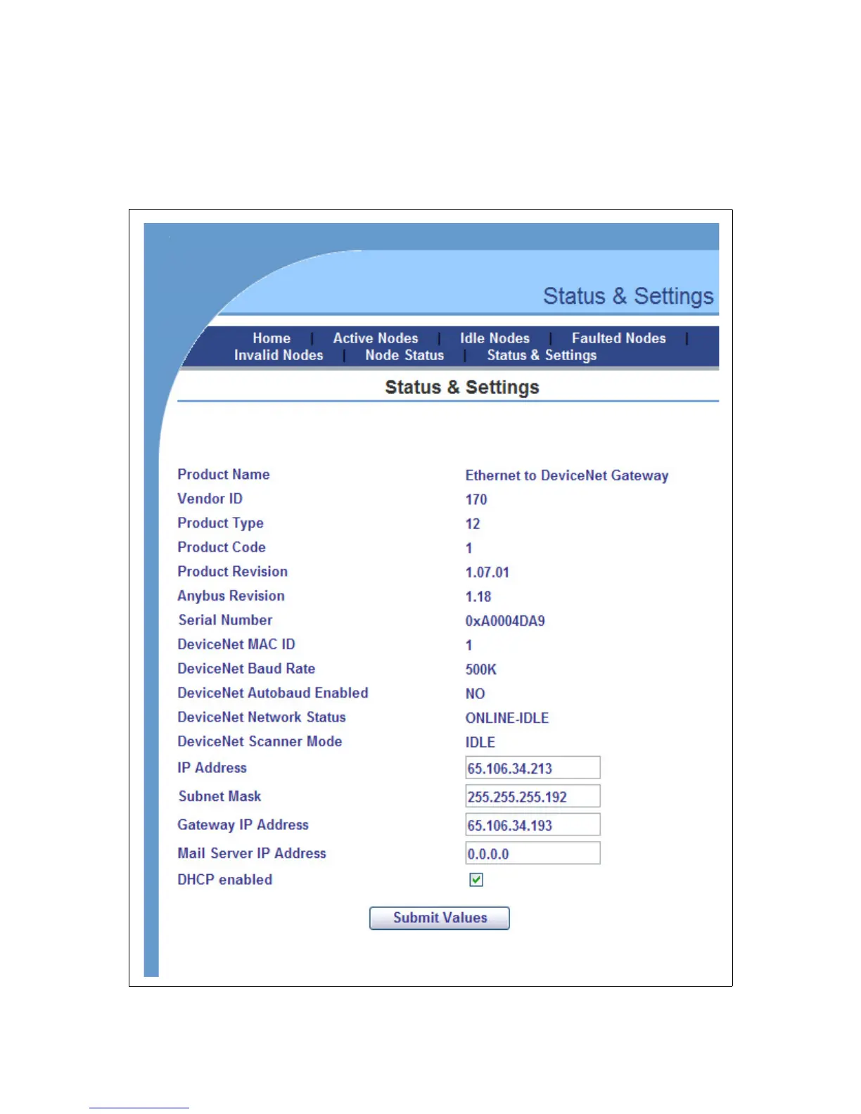 page resident on the Anybus-X. The Status and Settings web page appears as