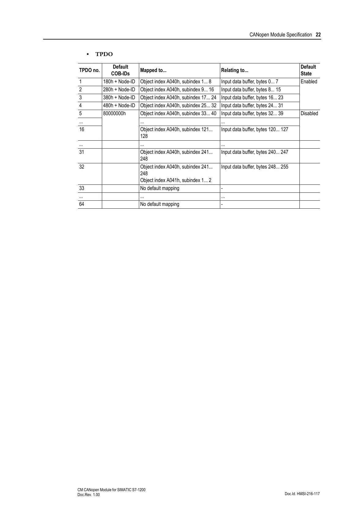 1 180h + Node-ID Object index A040h, subindex 1... 8 Input data buffer, bytes 0... 7 Enabled