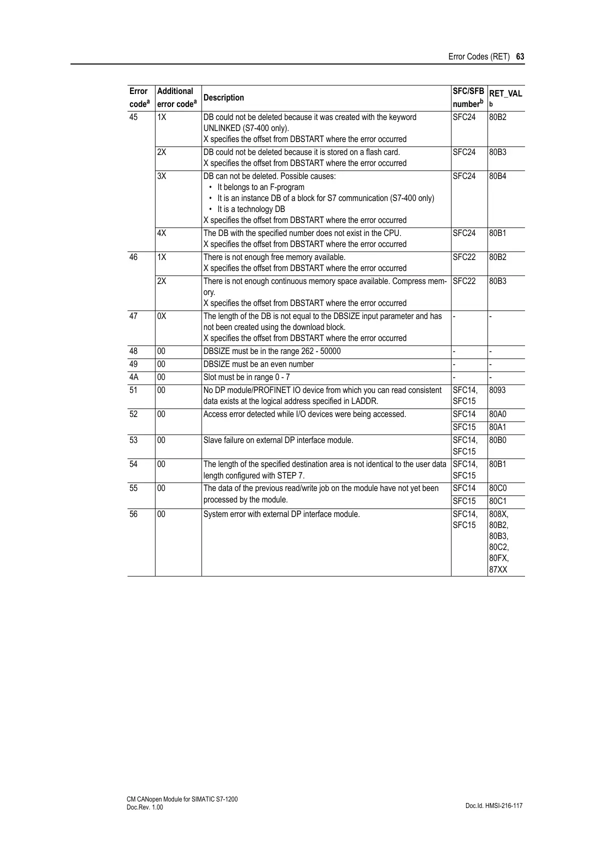 Error Codes (RET) 63