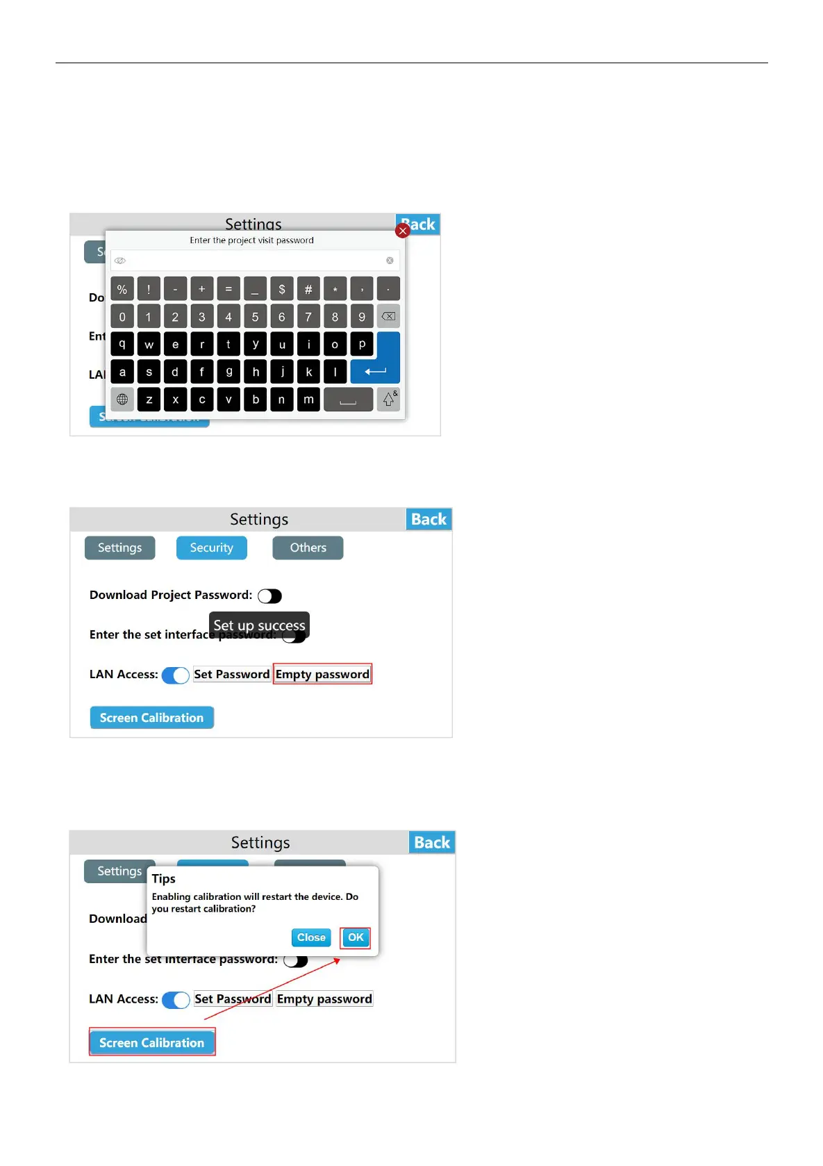 Click [Empty password], a pop-up "set up success", that is to clear the previous LAN password, users can access the HMI