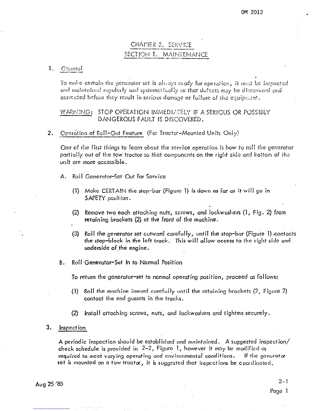 (3) Roll the generator set cutward carefully, until the stop-bar (Fig&e l).cont~cts