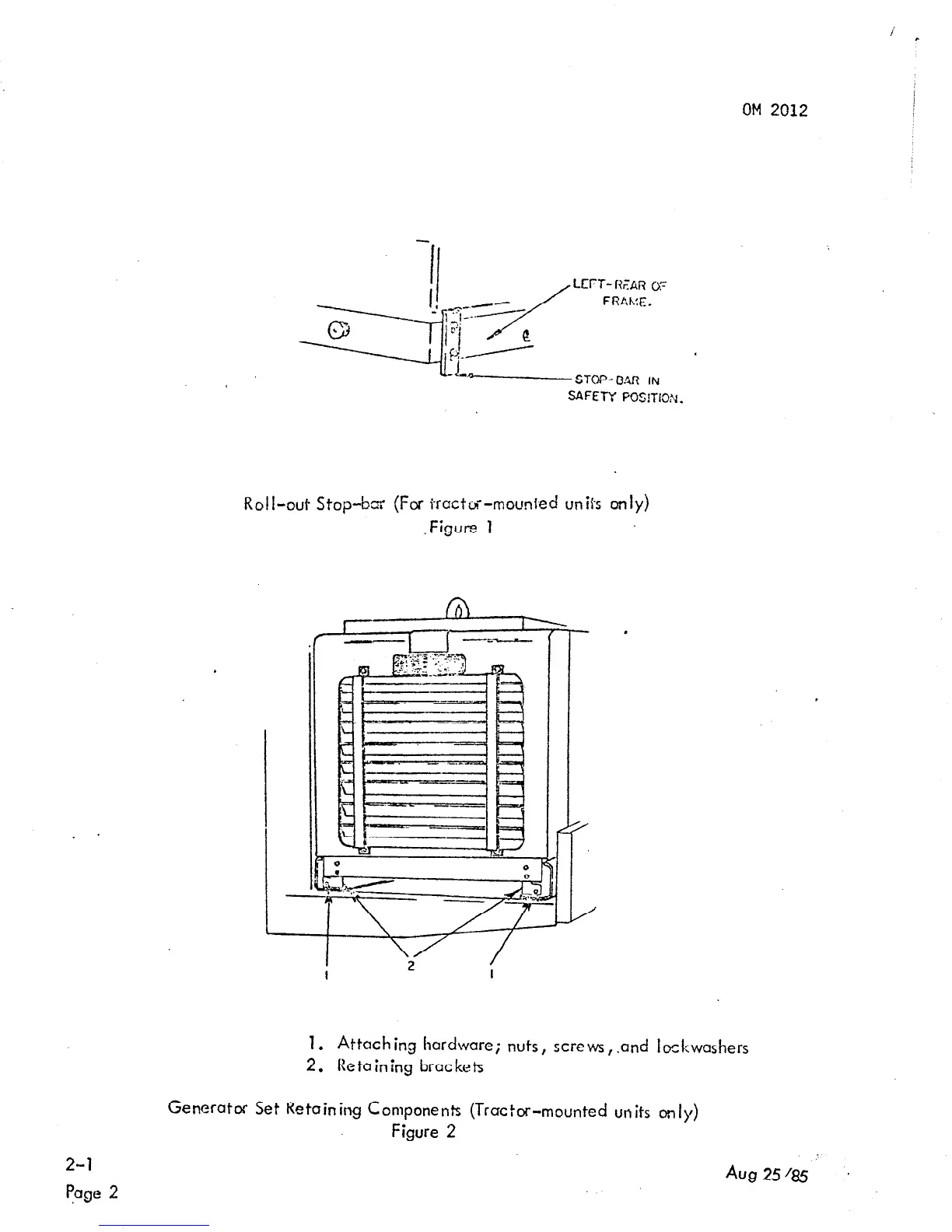 Generator Set Retaining Components (Tractor-mounted units only)
