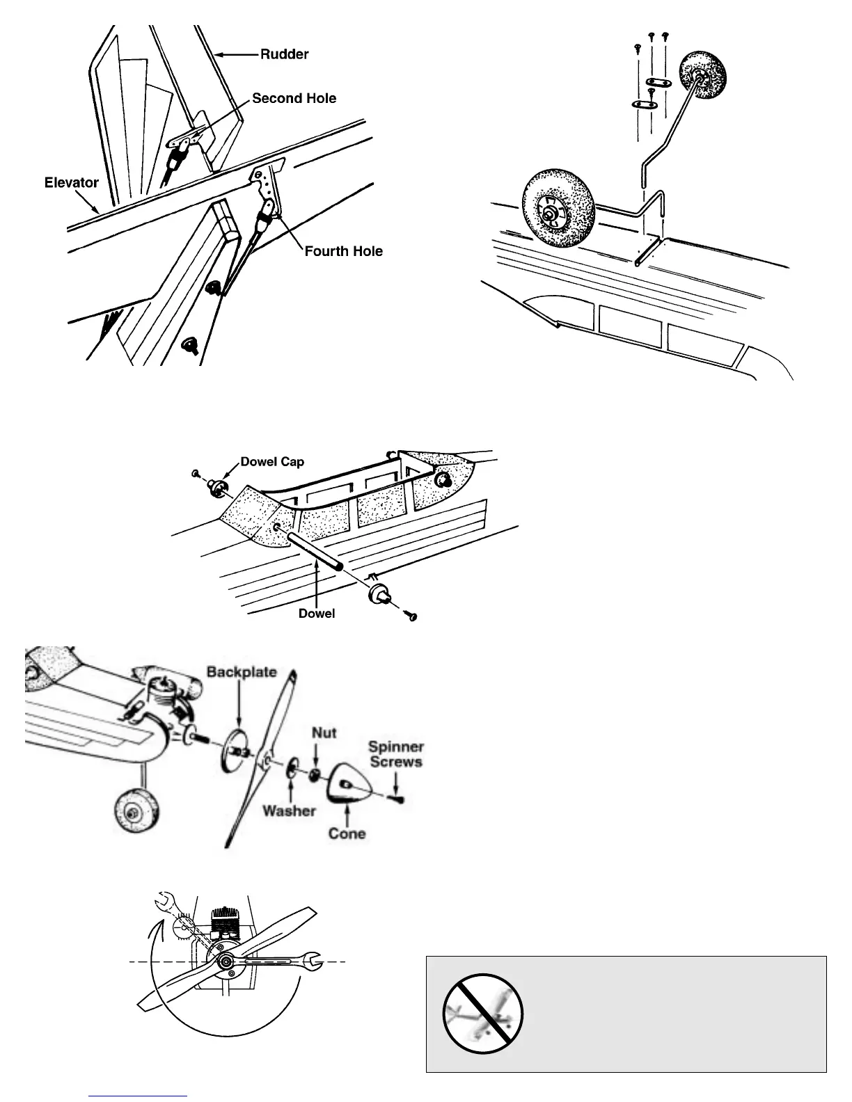 ❏ 5. Insert the wood dowels into the fuselage. Secure the