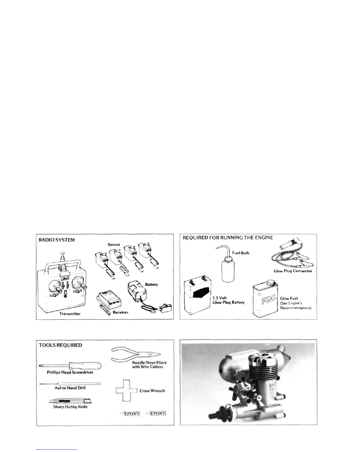 Most engines require a 1 .5V glow plug starting battery. a glow plug clip, and a quality brand fuel