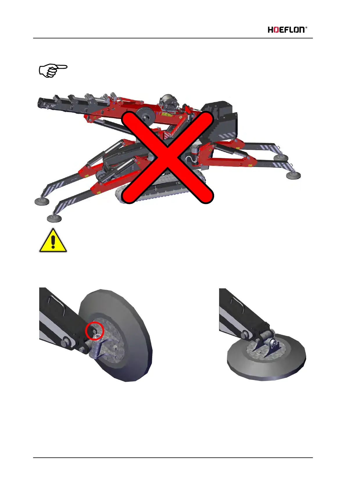 Do not put all of the outriggers in line with the crane (< 5°). The crane will topple very easily.