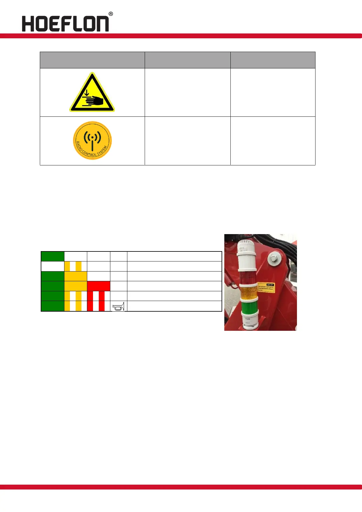 A signal column is fitted on the compact crane. The meaning of the colours is shown below. When