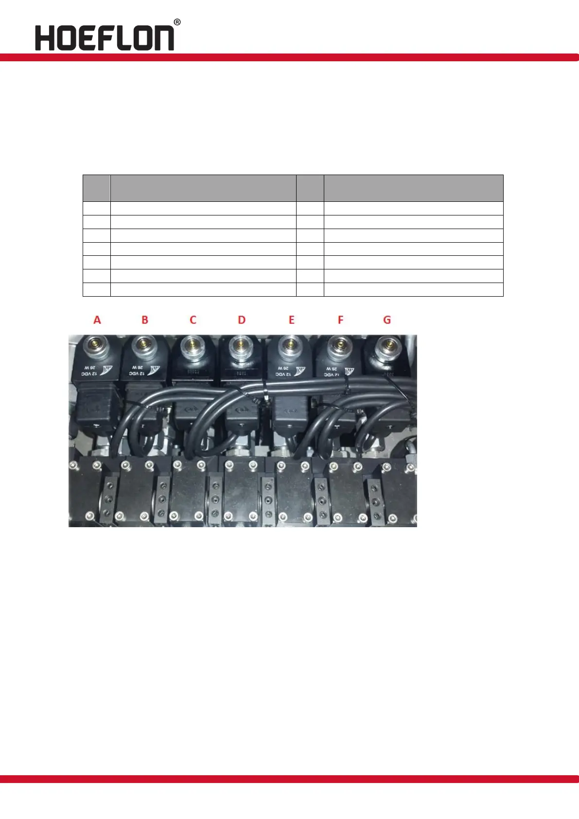 The table below shows which two functions per valve can be operated. Functions A to G
