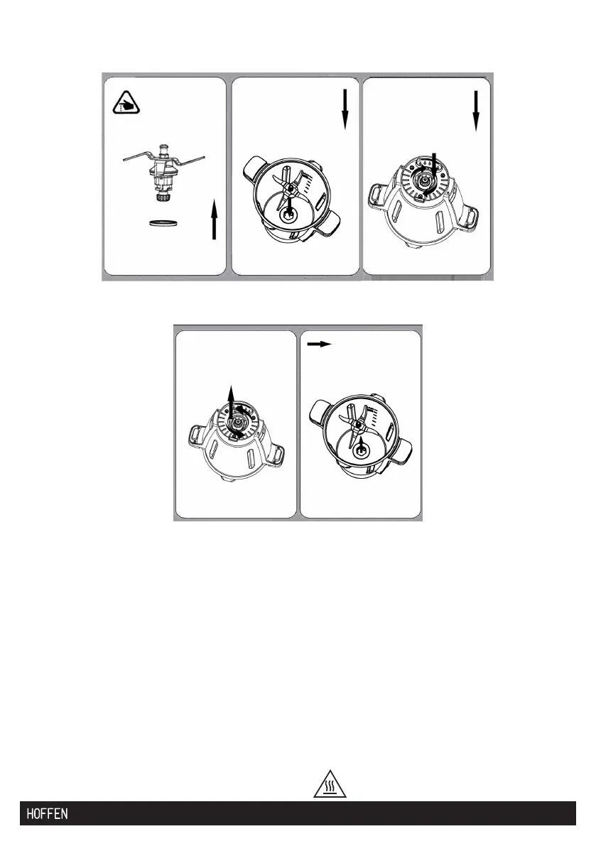 1. Place the blade gasket (E) on the blades. Push the blades through the opening