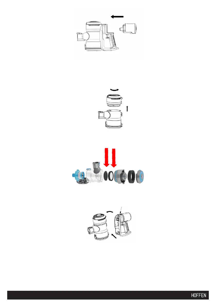 4. Connect the handle with battery base to the dust container: align the dust con-