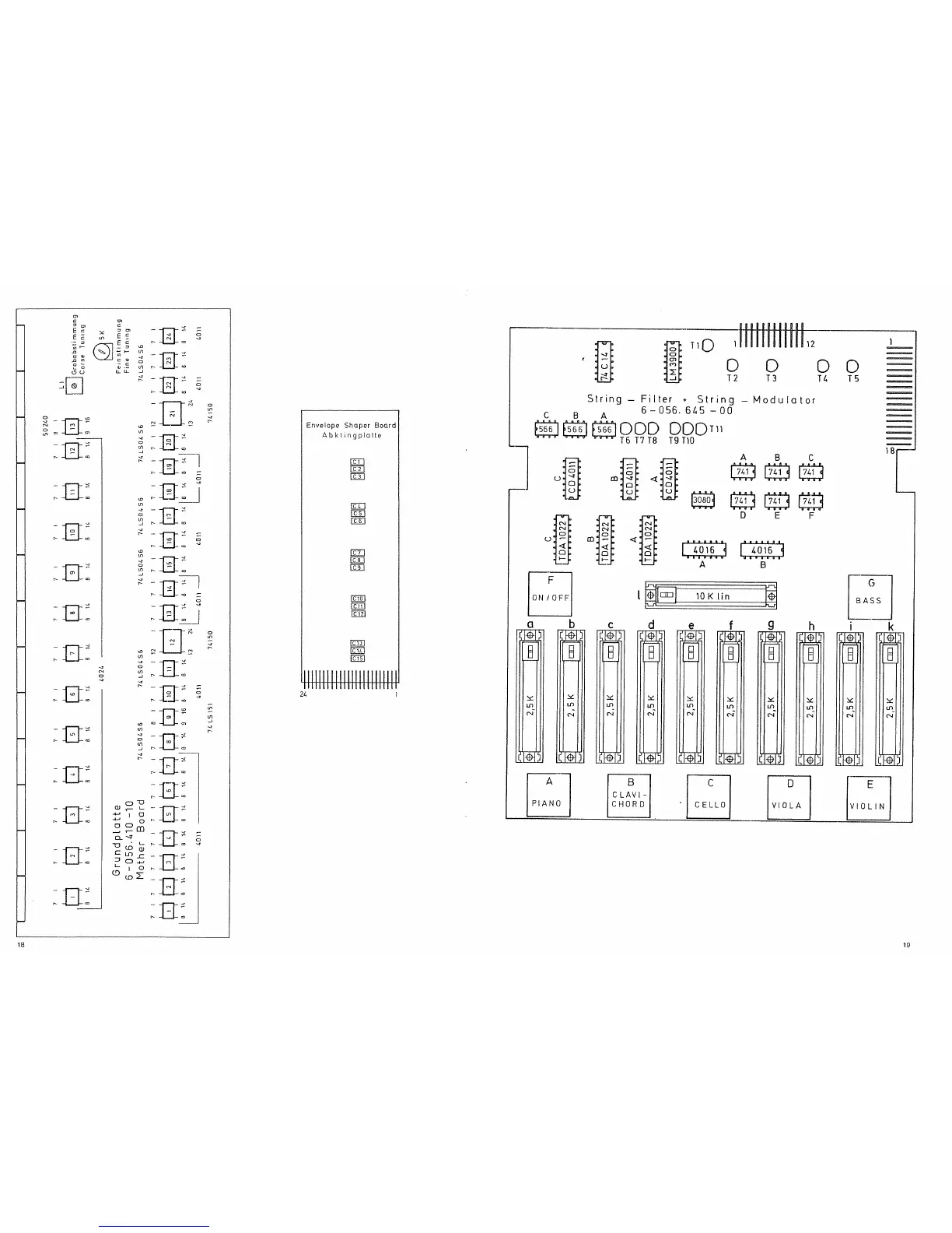Hohner String Performer - Component Layout Diagrams; Mother Board Layout; Envelope Shaper Board Layout; String Filter and Modulator
