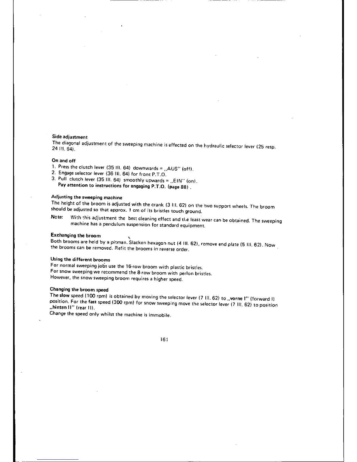 Holder Park 70 - Side Adjustment; On and off; Adjusting the Sweeping Machine; Exchanging the Broom