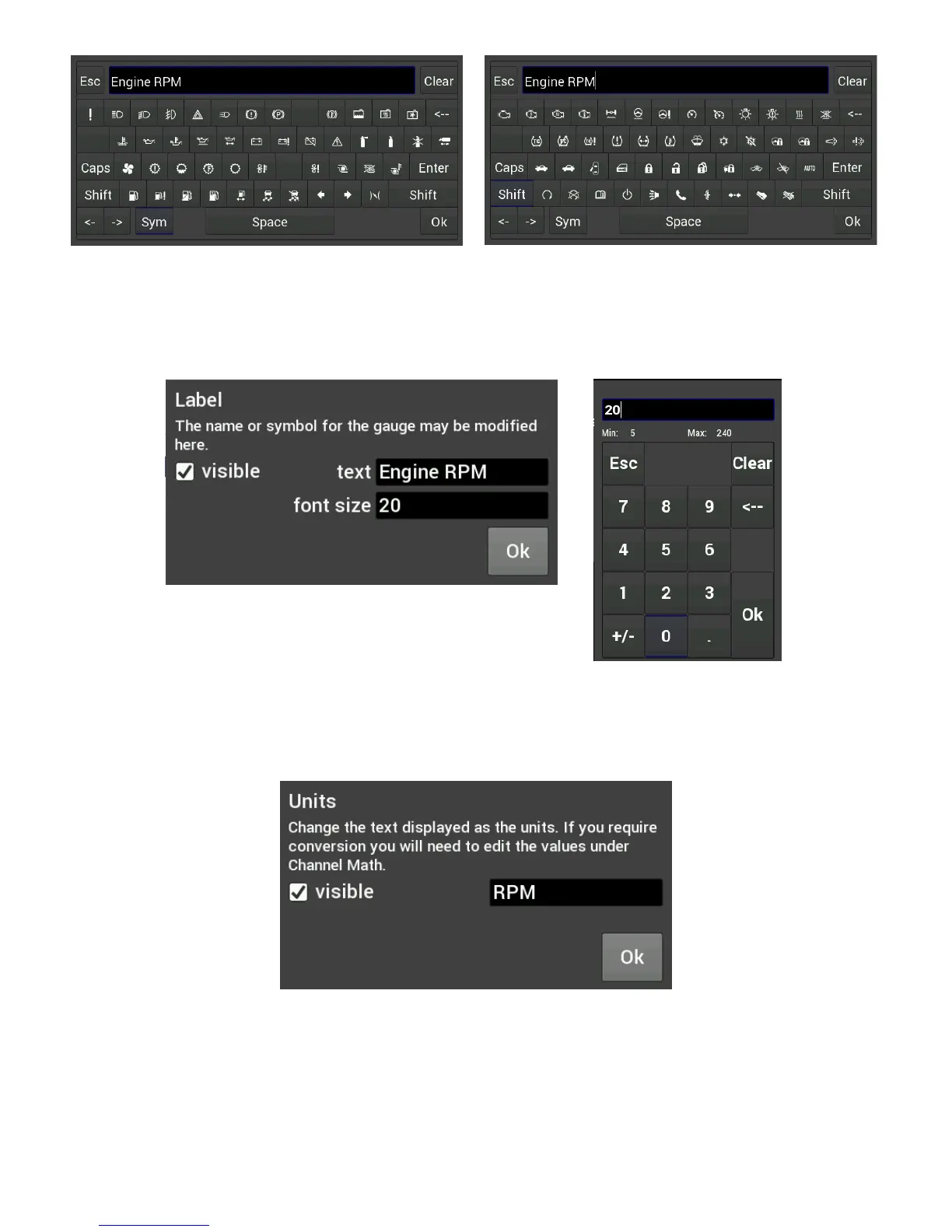 The ‘Units’ label can be modified in the same fashion as the gauge label. To do this, touch inside the text box