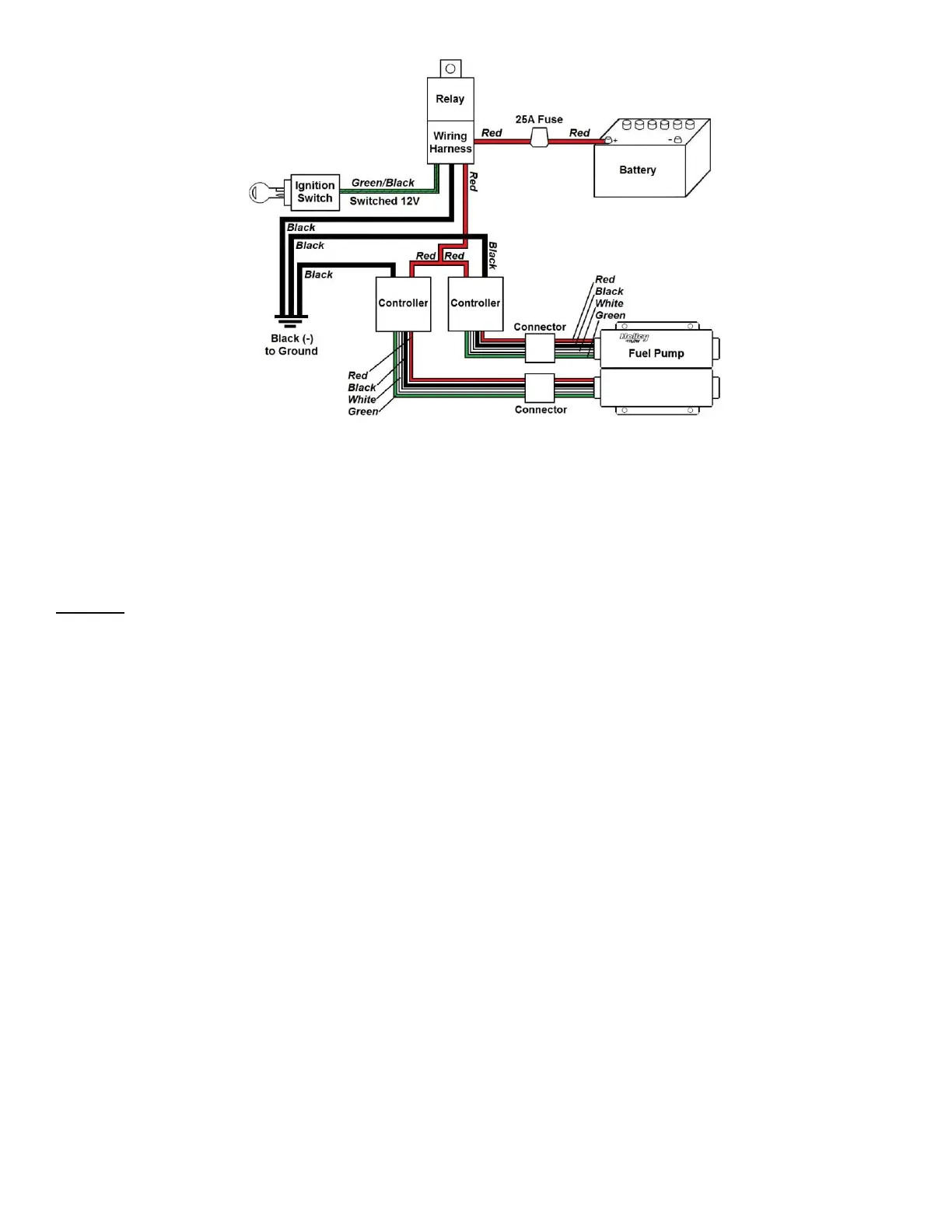 5. Connect the Green/Black wire of the relay harnesses to a switched 12 volt source. If one pump is being used as an additional fuel