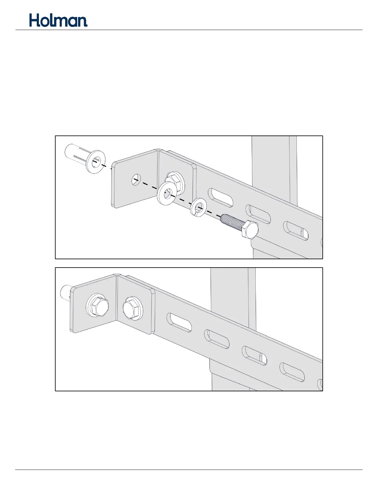 • Align the angle bracket with the installed plus nuts. Bolt into place using 1/4" x 1” hex head