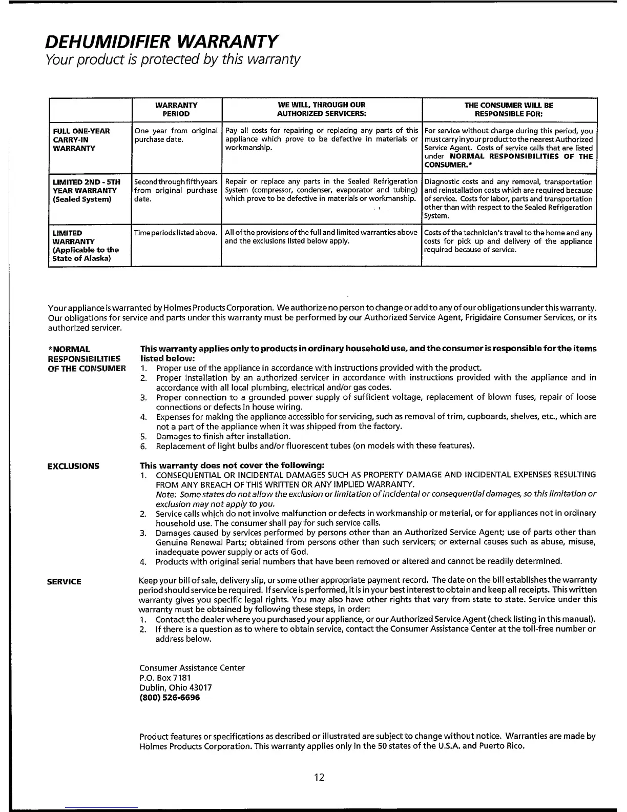 Holmes Dehumidifier - Dehumidifier Warranty; Warranty Coverage Details; Consumer Responsibilities; Service Procedure