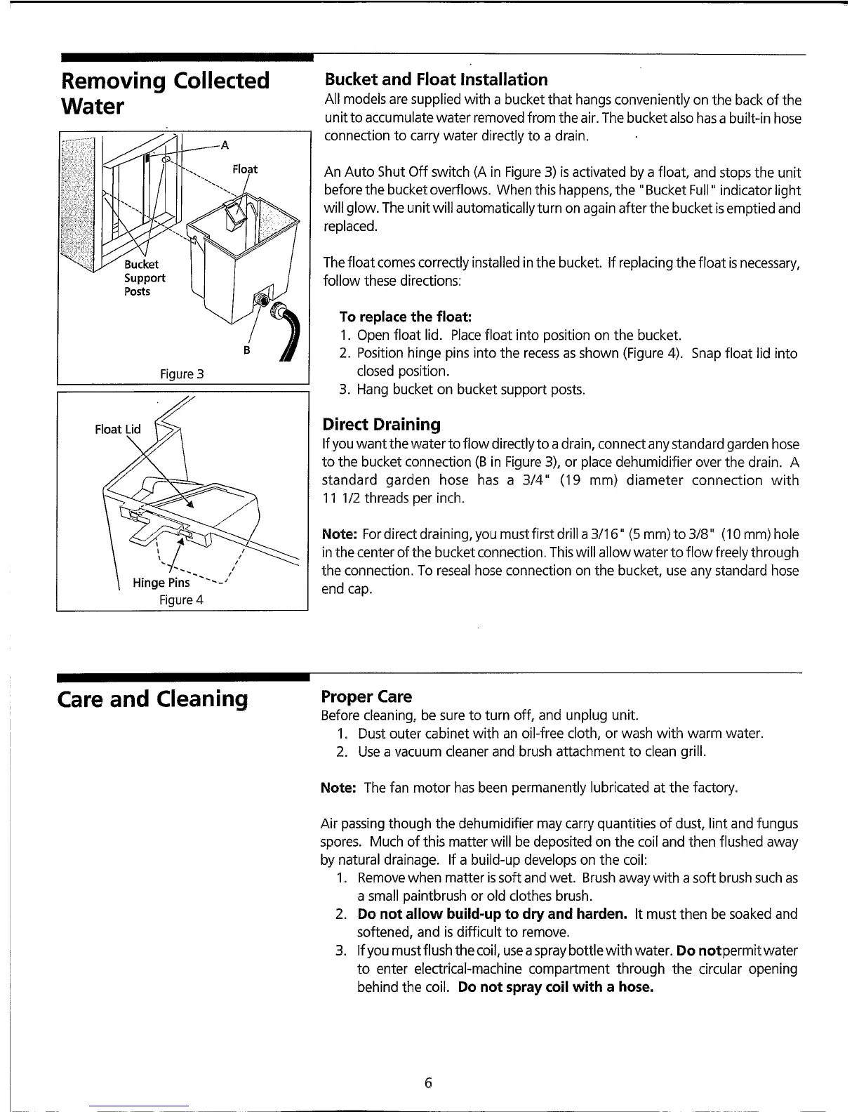 Holmes Dehumidifier - Removing Collected Water; Bucket and Float Installation; Direct Draining; Care and Cleaning