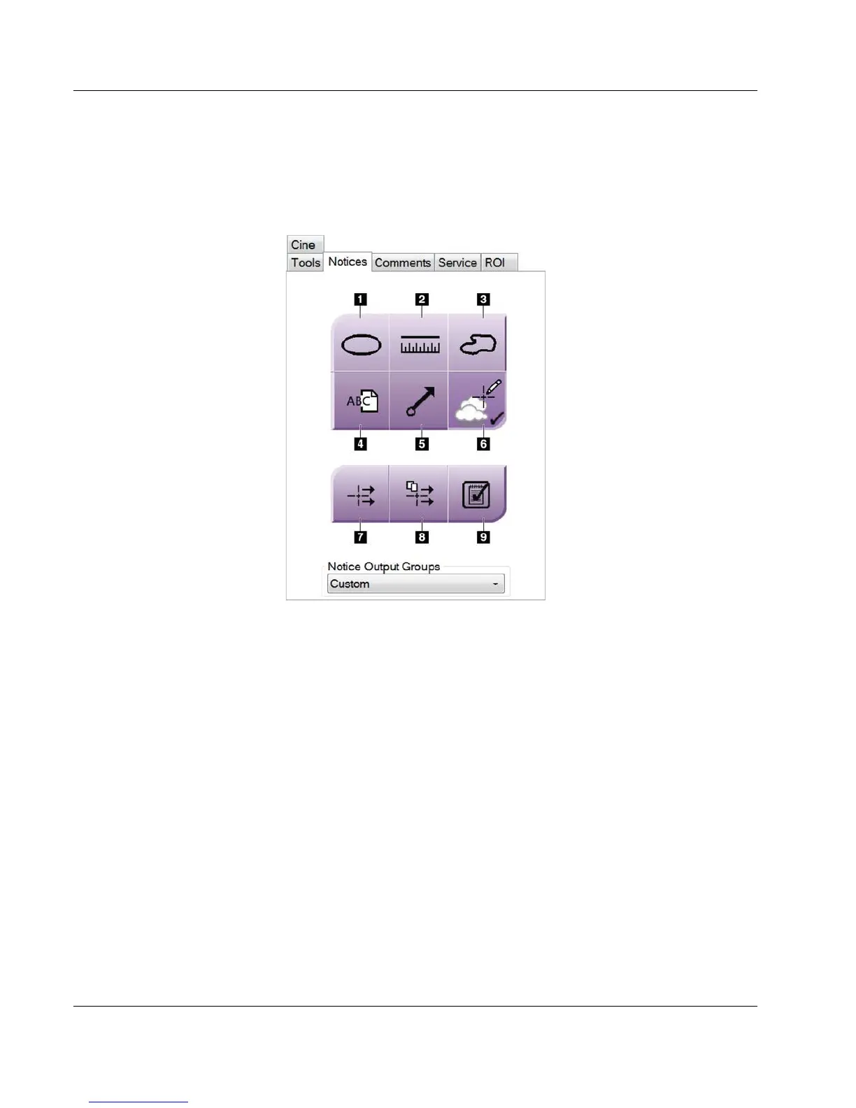 about the displayed image or procedure. The Notice Output Groups drop-down menu at