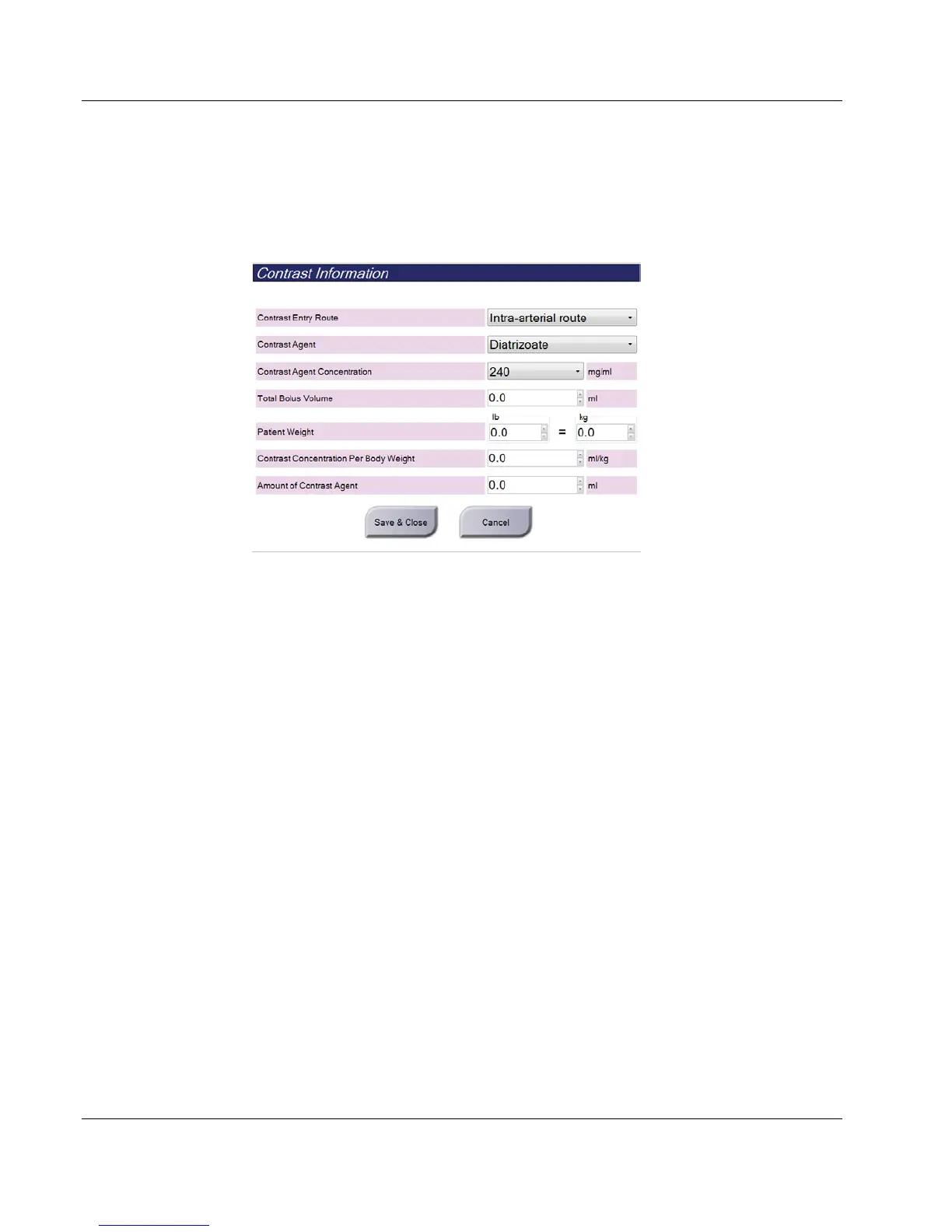 3. Enter data for the Contrast Concentration Per Body Weight field or the Amount of