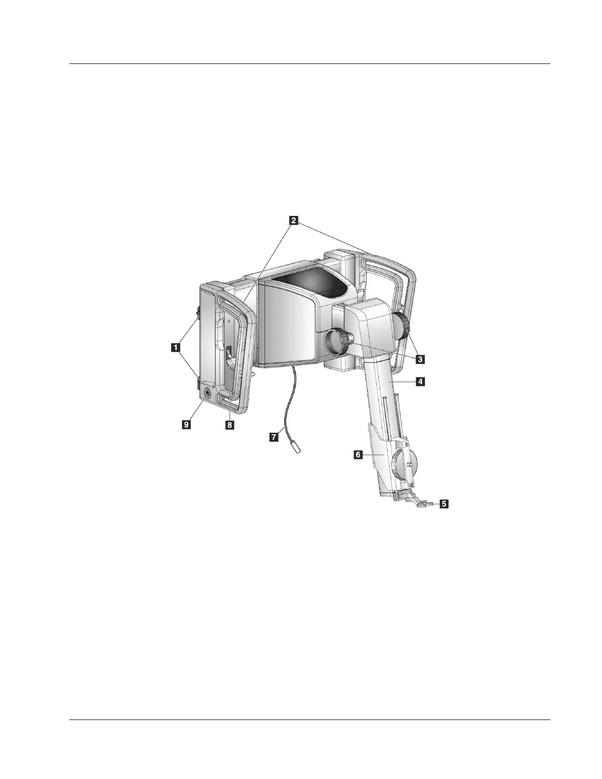 module in position. A cable (item 7) connects to the side of the C-arm for operation of the