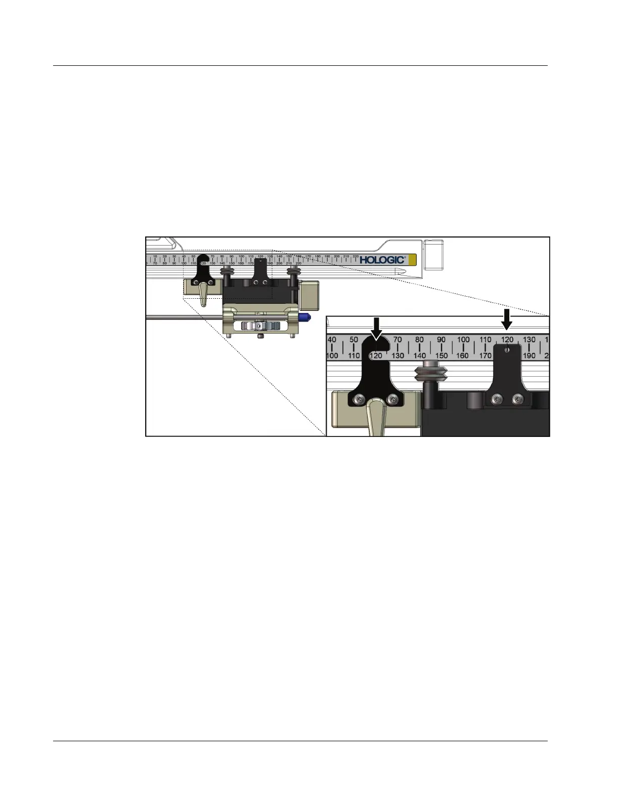 the bottom scale of the Lateral Arm. During a procedure, the X-Stop is positioned at the