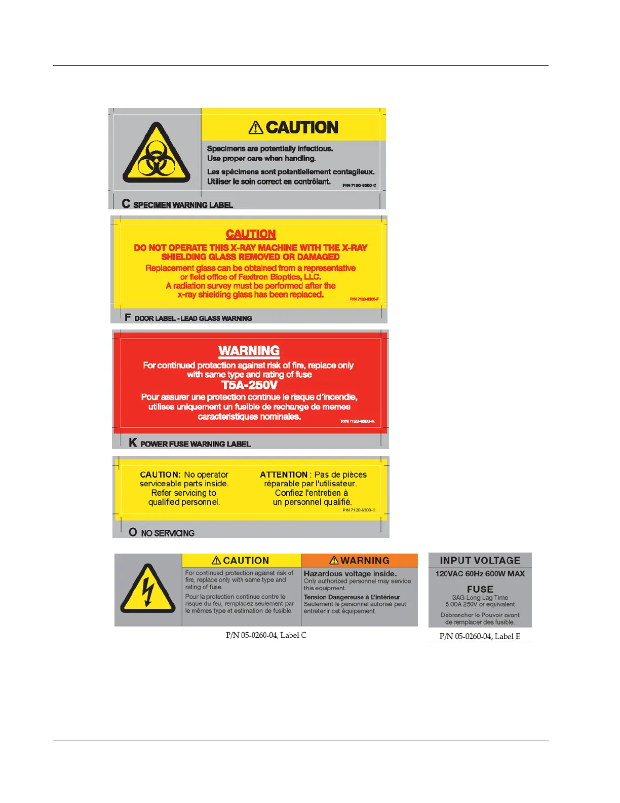 Hologic Faxitron CT - Figure 7: Labels C, F, K & O from P;N 7120-6300 Label Set and; Labels C & E from P;N 05-0260-04 Label Set