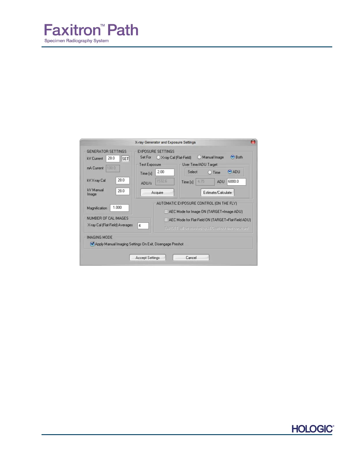 NOTE: The kV, Exposure Time, and ADU/s values may vary from those shown.